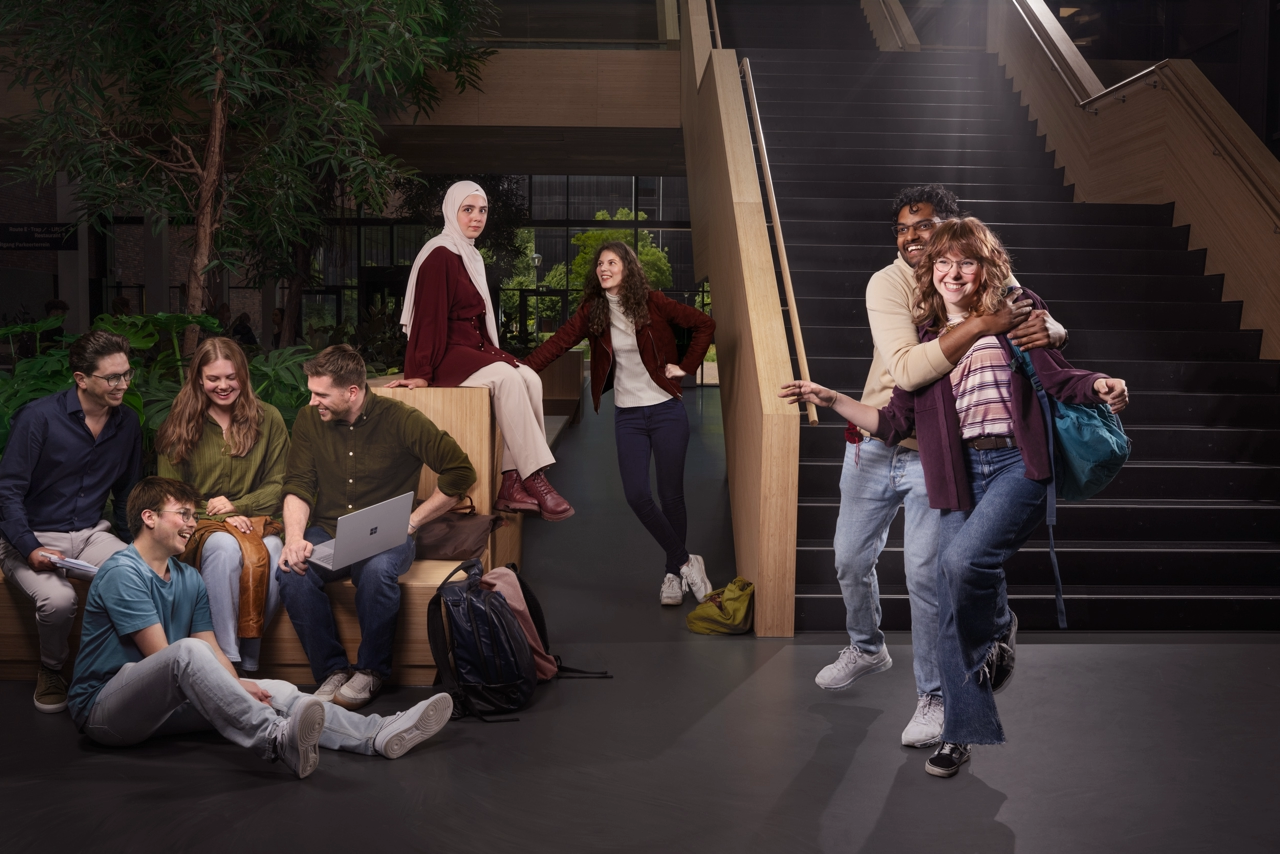 Cinematisch geënsceneerde groepsfoto in een universiteitsgebouw met trap en zitplekken, waarin studenten elkaar ontmoeten, samenwerken en zich door de ruimte bewegen.