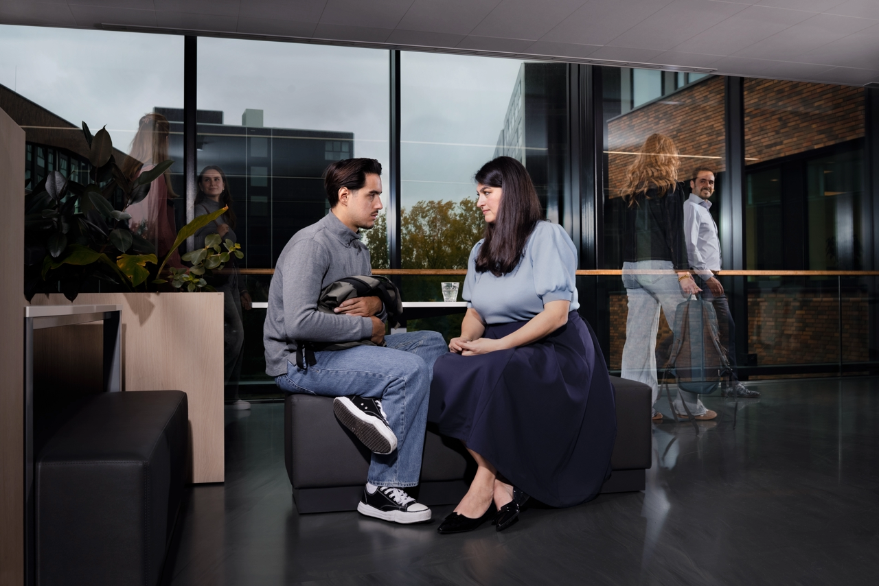 In een moderne binnengang met grote ramen zitten twee personen dicht tegenover elkaar op een lage bank. De persoon links heeft een jas tegen zich aan en zit iets voorover; de persoon rechts zit met de handen in de schoot en kijkt terug. Achter het glas en in de gang bewegen andere mensen langs, deels als reflectie zichtbaar, waardoor voorgrond en achtergrond elkaar overlappen. De zorgvuldig gecomponeerde scene legt de nadruk op een gesprek binnen een drukke institutionele omgeving.
