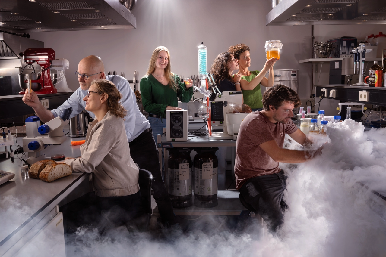 In een professionele keuken- en labruimte werken meerdere mensen tegelijk aan experimenten met apparatuur, meetglazen en potten met vloeistof. Links onderzoekt iemand met een microscoop een monster terwijl brood op het werkblad ligt; in het midden staan laboratoriuminstrumenten en flessen opgesteld. Rechts houdt iemand een bak met dampende inhoud vast, terwijl een ander met beschermende handschoenen aan werkt tussen opstijgende witte rook. De zorgvuldig gecomponeerde scene verbindt voedsel, wetenschap en praktijkonderzoek in één beeld.