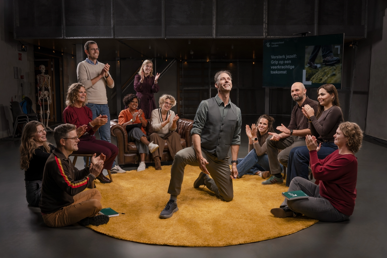 In een ruime, donkere studio-achtige ruimte zit en staat een groep mensen in een halve cirkel rond een groot geel vloerkleed. In het midden knielt één persoon met één knie op de grond, terwijl de anderen klappen en naar het midden kijken. Er staan stoelen en een leren bank rondom, en rechts hangt een groot scherm met tekst en beeld. De zorgvuldig gecomponeerde scene benadrukt groepsdynamiek, erkenning en een gezamenlijk moment in een institutionele setting.