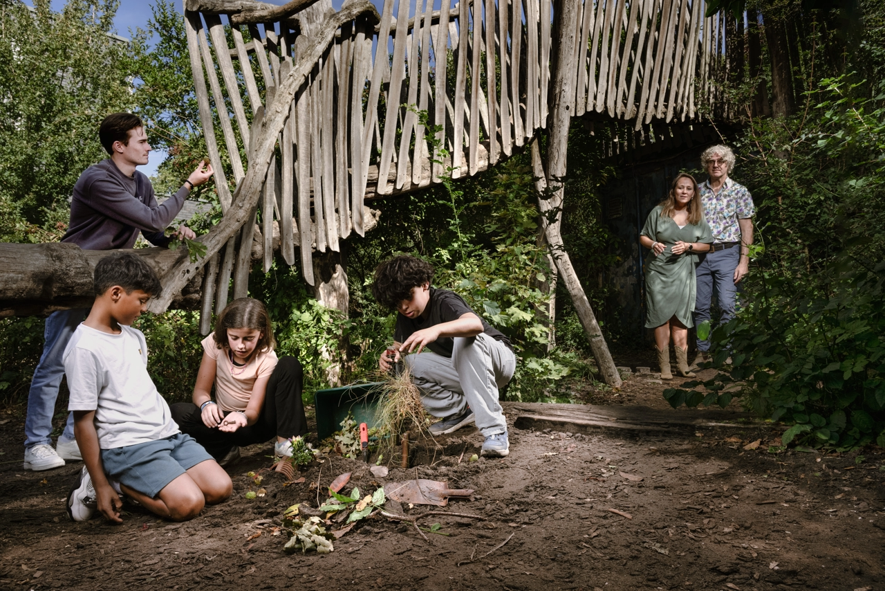 In een groene buitenomgeving knielen drie kinderen op de grond rond planten en tuingereedschap, terwijl een jongere links op een boomstam zit en toekijkt. Boven hen loopt een houten brug- of speelconstructie van ruwe takken en planken door het beeld. Op de achtergrond staan twee volwassenen in de schaduw van het pad, kijkend naar de activiteit in de voorgrond. De compositie laat een gedeelde leeromgeving zien waarin natuur, spel en zorg voor de plek samenkomen.